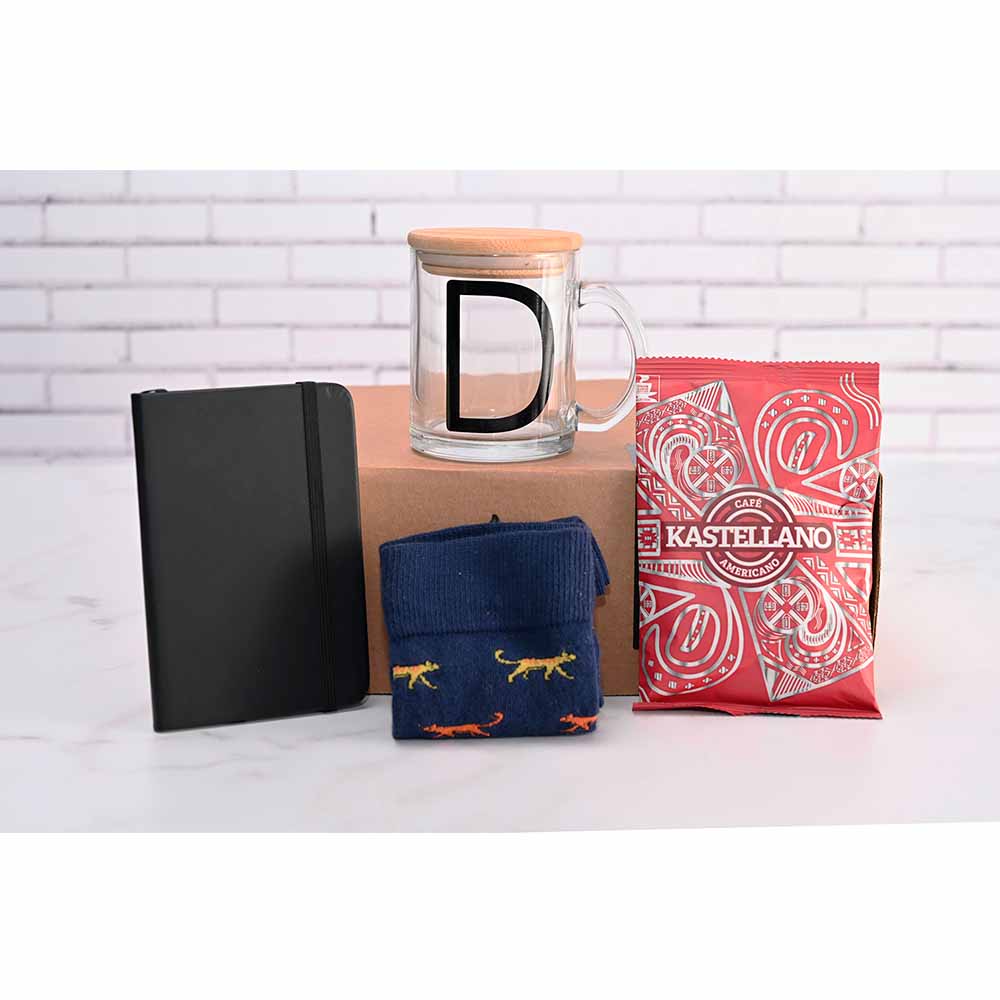 Kit de regalo que contiene taza con vinil, Bolsa de Café, libreta y calcetas.